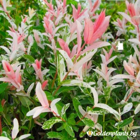 Растежът му е компактен, а клоните се оформят като топка. През пролетта листата са розови, като постепенно с напредването на сезона вариегатните листа добиват нюанси на розово, кремаво бяло и зелено.