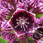 Цветовете с форма на чашка във вътрешността си са обагрени в патладжанено лилаво, което по ръба на венчелистчета и в основата прелива в бледорозово.