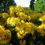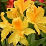 Азалия Златен топаз е сорт със златисто-жълти цветове с оранжево петно в среда