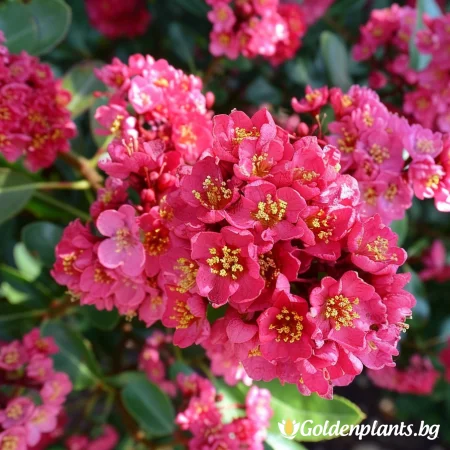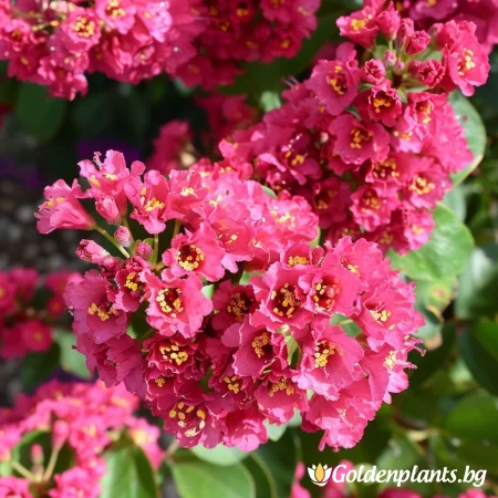 Декоративен храст или малко дръвче с изправен растеж и богати съцветия от наситено червени цветове. Цъфти дълго – от средата на лятото до есента. Листата са лъскави, тъмнозелени, а през есента се обагрят в оранжево-червени тонове. Подходящ е за слънчеви места и добре дренирани почви, като създава ярък акцент в градината.